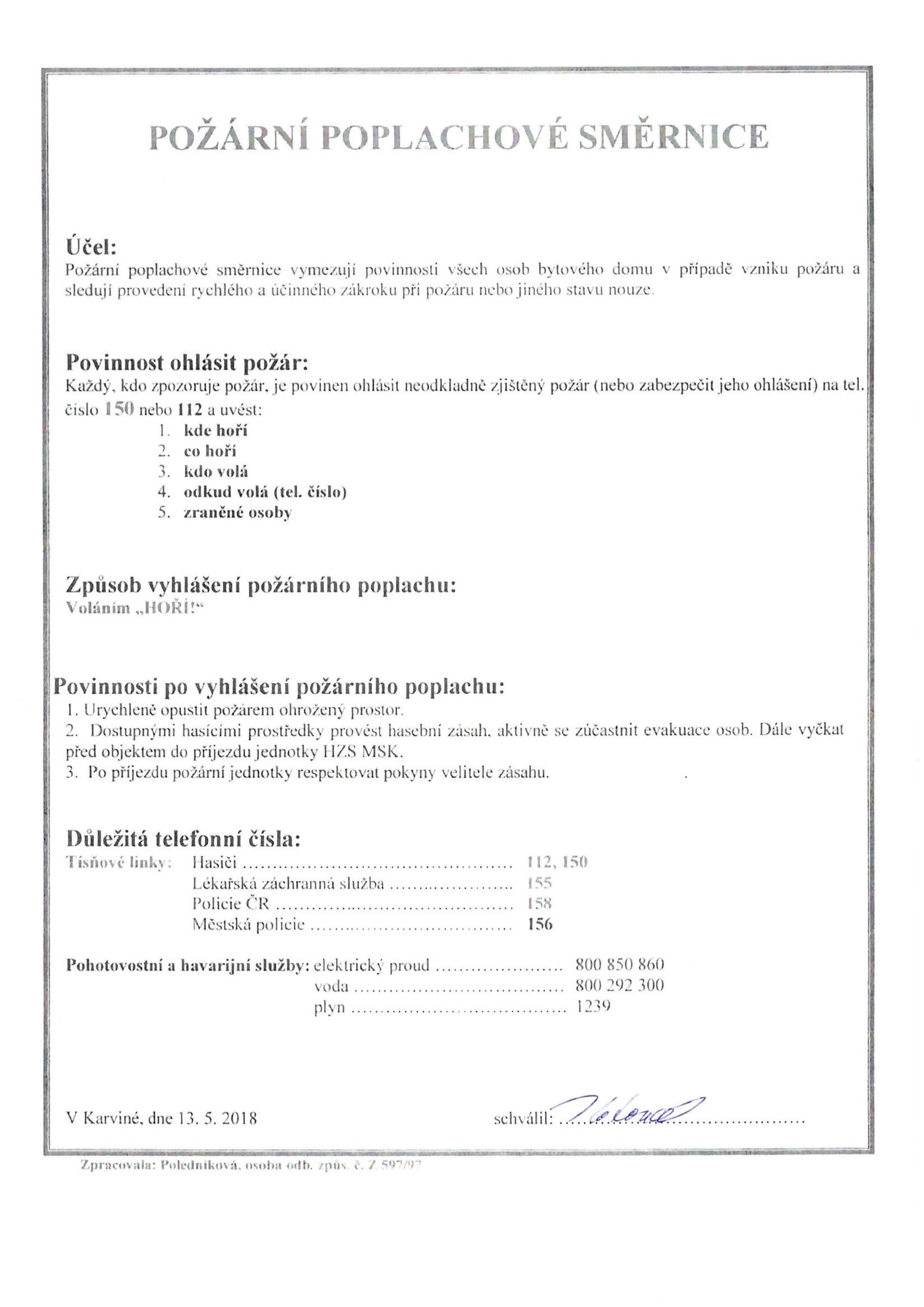 | Hlášení havárií – poruchová služba (opravy v bytě – ÚT, stoupačky,..) | 596 320 011 |